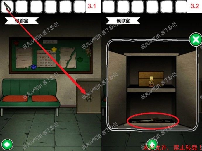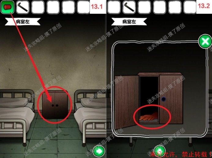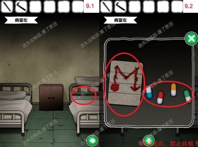 9.病室内向左,右侧病床的枕头底下获得2个提示(如图9.1、9.2),无需捡起来,记住就行。