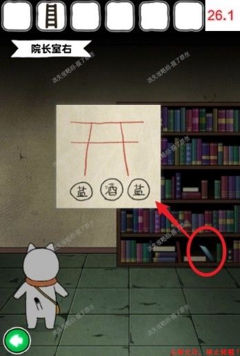 26.点击书架最底层斜着的蓝色笔记本,获得提示神龛底下放盐、酒、盐如图(26.1)。