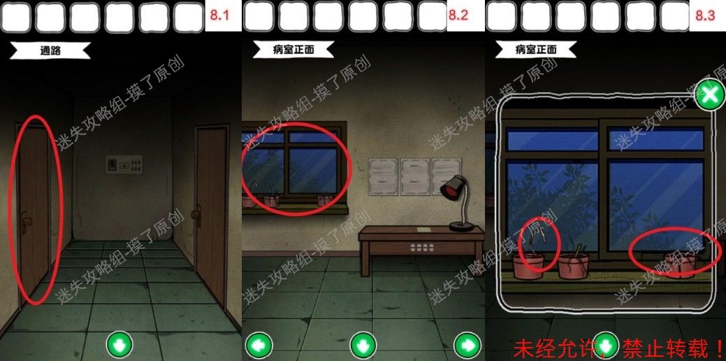 ——————↑难点:找到手电筒电池8.点击左侧门前往病室正面,点击窗台获得花盆里的分针和窗框右下角的起钉器(如图8.1、8.2、8.3)。