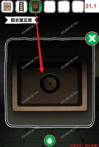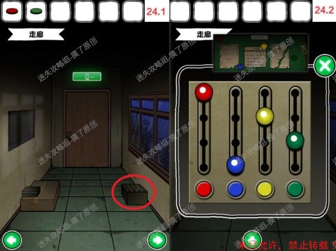 24.前往走廊,点击左侧箱子,把按钮装在箱子上,并按照候诊室折纸的高度点击按钮排序,获得扳手(如图24.1、24.2)。
