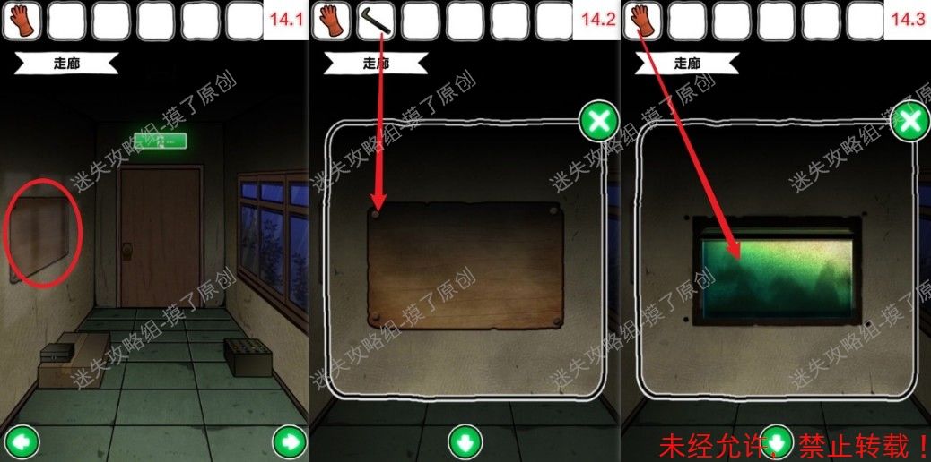 14.返回走廊,点击左侧木板,用起钉器拆下钉子,用橡胶手套在水箱里获得镊子(如图14.1、14.2、14.3)。