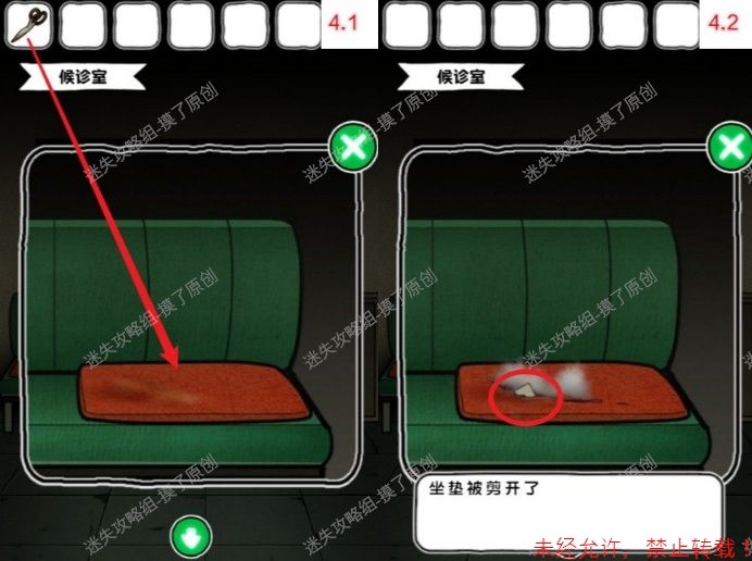 1.从接待处向右两次到达候诊室,点击沙发左侧垫子,获得钥匙(如图1.1、1.2)。