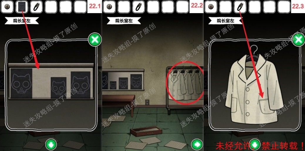 22.向左,把x光片放在左侧,点开右侧衣架,点击从左往右数第三件白大褂,用裁衣刀剪开口袋,获得绿色按钮(如图22.1、22.2、22.3)。