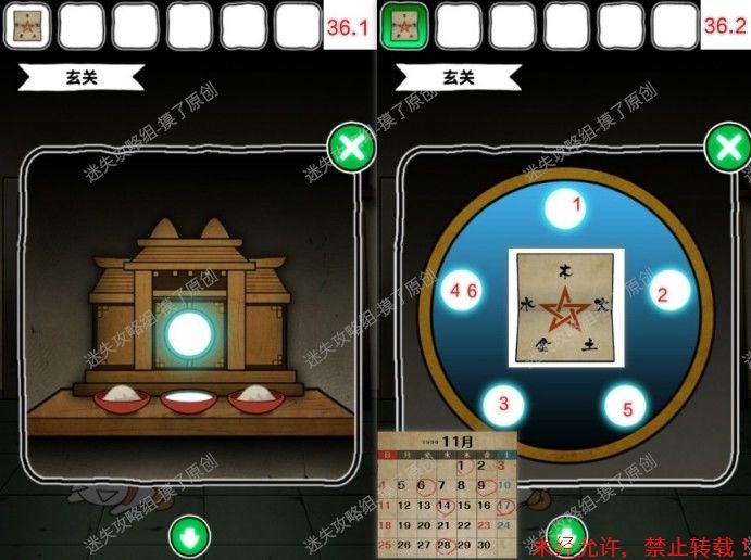 36.点击中间发光部位,如图顺序点击五角星(如图36.1、36.2)。解码线索为“五行图纸片及候诊室日历画圈日期顺序”。