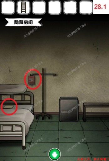——————↑开密室28.进入密室,从枕头底下获得一张写着金木水火土的纸,并点击获得床边的输血袋(如图28.1)。