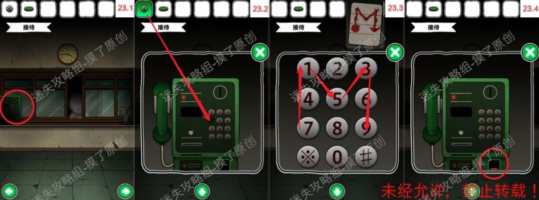 23.返回最初的接待处,点击左侧绿色电话,把4号按钮装上,并按出7415369,获取红色按钮(如图23.1、23.2、23.3、23.4)线索为之前病房枕头底下的药片。