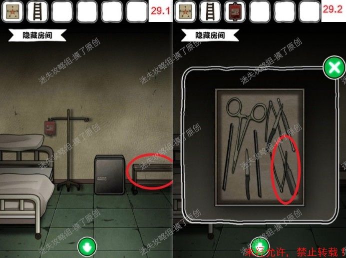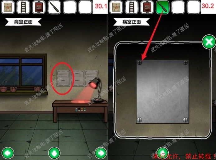 30.返回通道左侧的病室,多次点击桌台上三张纸最左侧的一张,用螺丝刀拧开螺丝,获得红色十字架(如图30.1、30.2)。