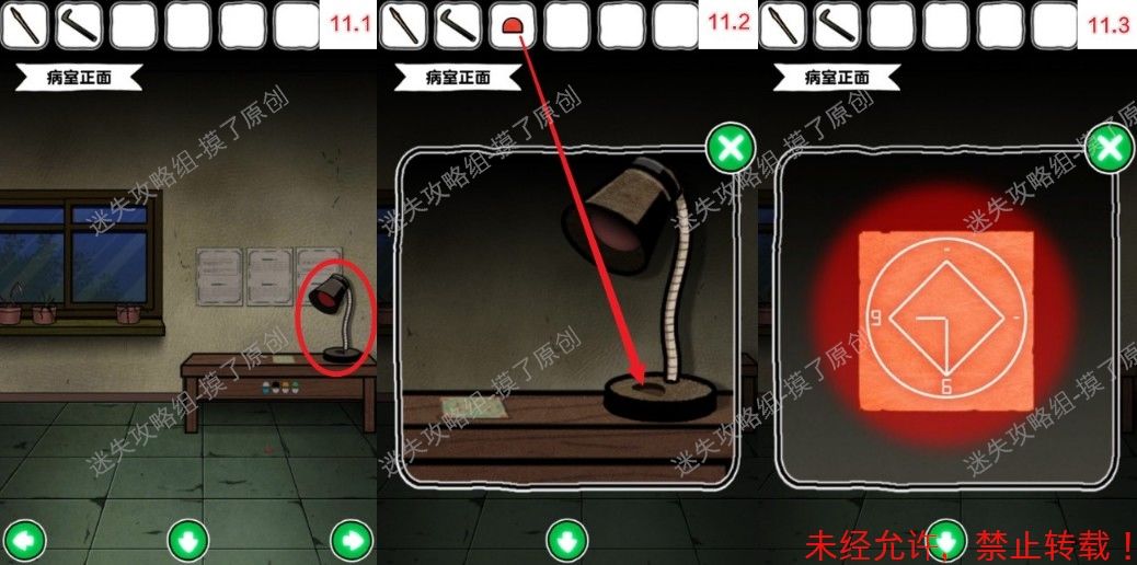 12.向右到达病室右,点击右侧架子上的闹钟,装上分针拨至9:30,获得红色把手(如图12.1、12.2、12.3)。