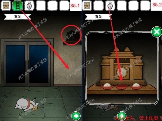 35.前往玄关(接待处左侧),把梯子架在供奉处底下,点击供奉处,中间倒上酒(如图35.1、35.2)。