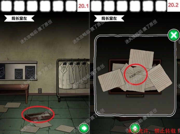 ——————↑右边门锁的钥匙20.在院长室中向左走,点击地上的抽屉,把上层稿纸点开,获得裁纸刀(如图20.1、20.2)。