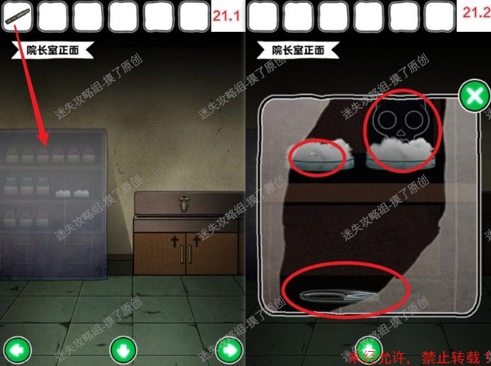 21.返回院长室正面,用裁纸刀划破柜子上的塑料膜,获得写着4的按钮、x光片、裁衣刀(如图21.1、21.2)。