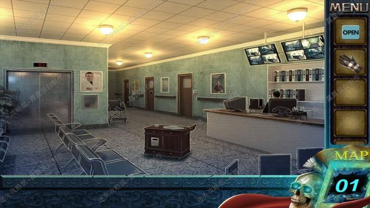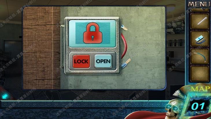 3、接着点击走廊右侧的第一扇门放大场景,将之前获得的“Open”标识牌置入其中,然后选择物品栏中的导线置入其中将线路修好,最后放上房卡就可以进入房间内了。3X1