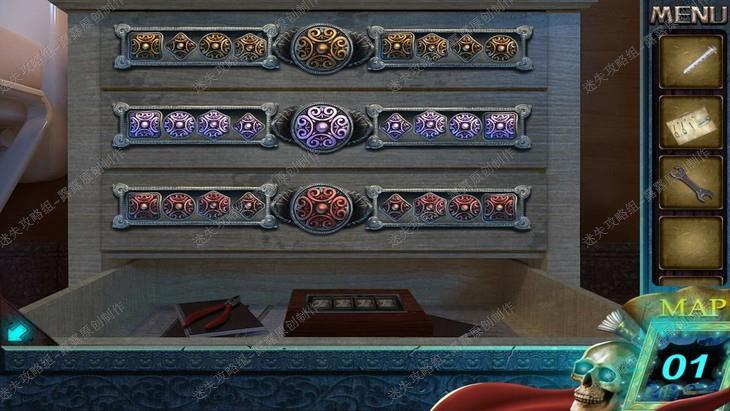 5、现在回到第一个房间里面,点击床头柜放大场景,将先前获得的装饰物置入其中,进入小游戏。这个小游戏的规则是将四排装饰物按照指定的图形顺序排列。完成小游戏之后柜子打开,点击拿走柜子里上锁的盒子和老虎钳。然后点击上锁的盒子输入密码“HELP”将盒子打开,点击拿走盒子里的头像。5X1