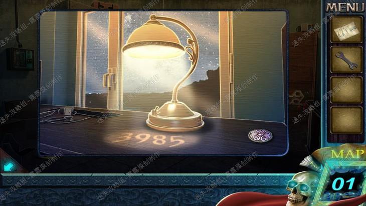 2、接着点击窗边的台灯放大场景,将物品栏中的灯泡置入其中,然后将灯打开,这时会浮现“3985”这一组数字,再点击拿走旁边的装饰物。2X1