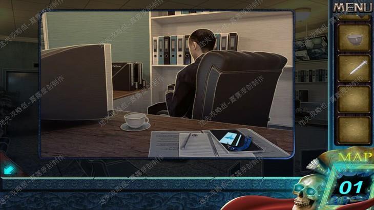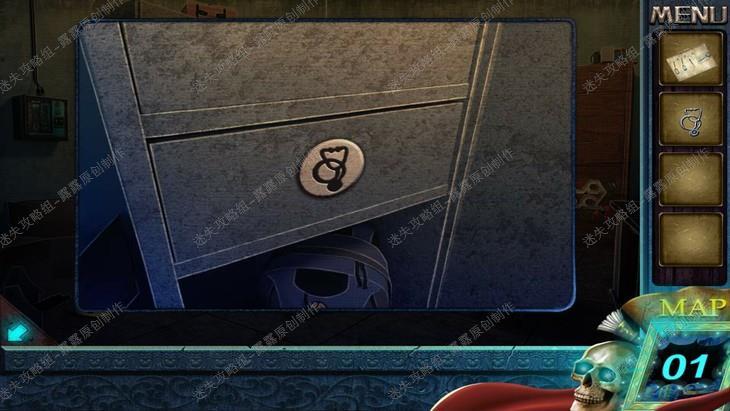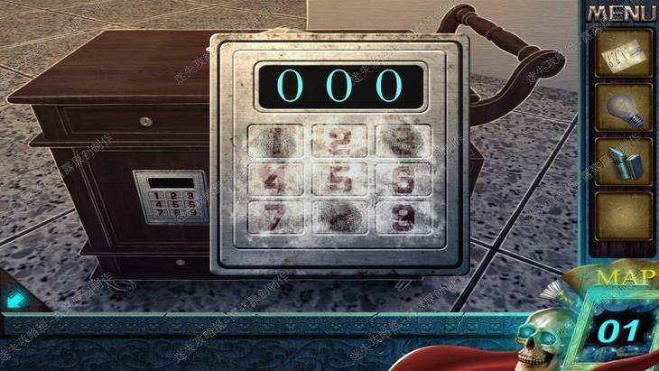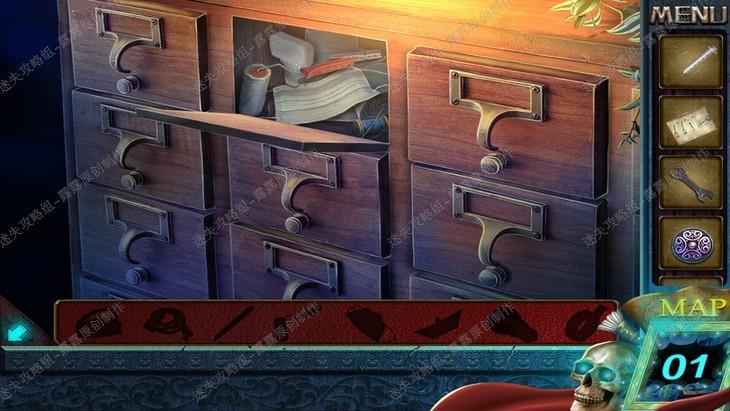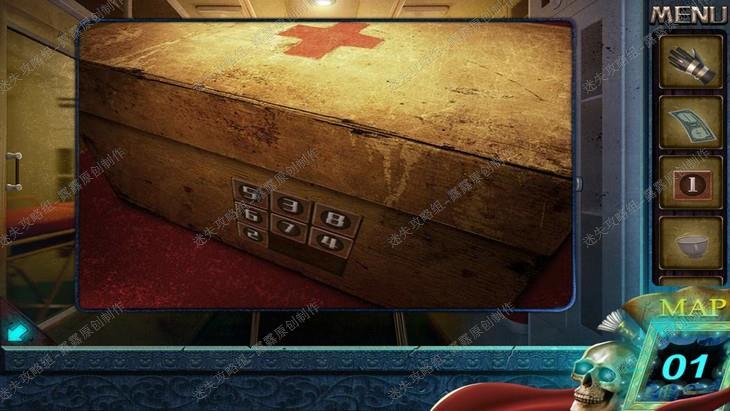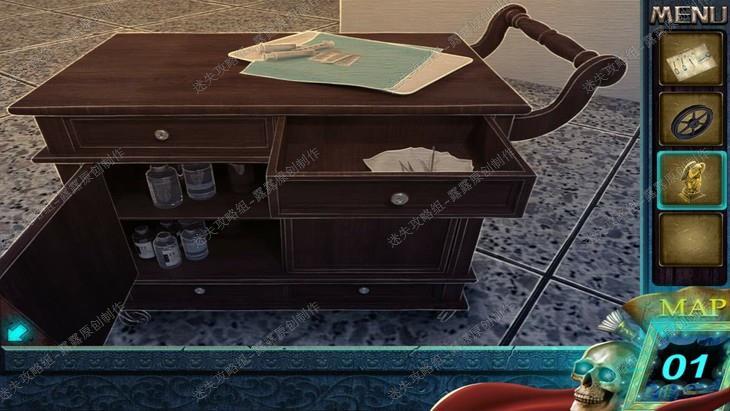 10、接着将叠好的毛巾和铁钩组合起来,前往二楼,图中即是二楼的场景。来到二楼之后点击中间的柜子放大场景,将柜子上的杯子给拿走。然后将抽屉拉开,拿走钞票和数字为1的号码牌。10X1