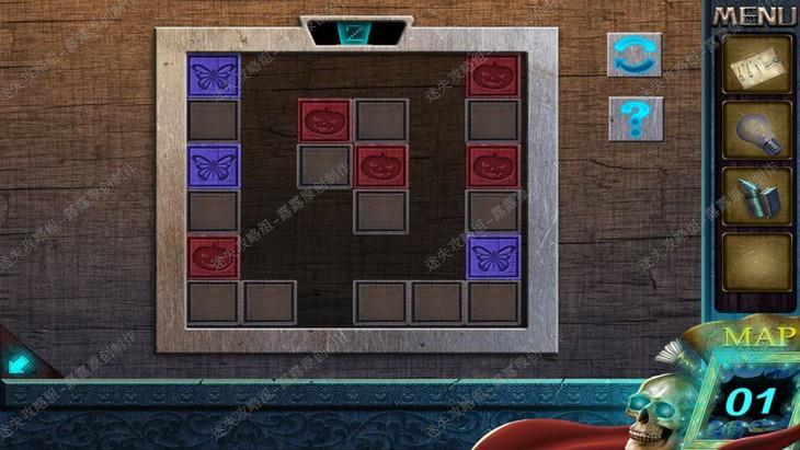 7、然后点击第二扇大门门口的墙壁放大场景,将先前获得的方块置入其中,进入小游戏。这个小游戏类似于俄罗斯方块,只有相同的方块连在一起才可以将其消除,消除所有的方块即可完成小游戏,随即旁边的门打开。7X1