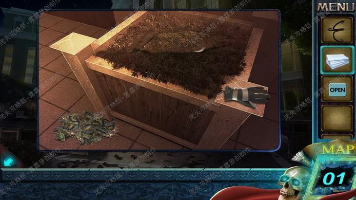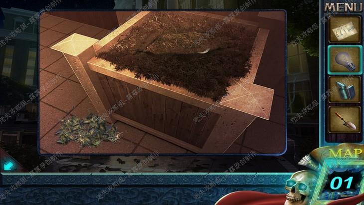 8、现在来到外面,先选择物品栏中的灭虫器将地上的虫子全部消灭,然后点击拿走扳手。接着选择物品栏中的铲子将泥土挖开,拿走里面的指示灯。8X1