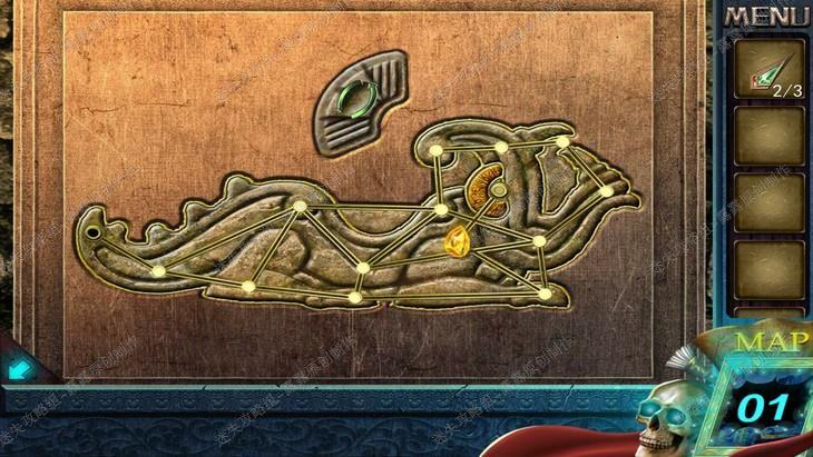 4、获得绿色小物件之后返回石像所在的房间内,点击右侧的墙壁放大场景,将先前获得的黄颜色的晶体置入其中,进入小游戏。这个小游戏的规则是将所有的点全部点亮。点亮所有的点之后暗盒就会打开,点击拿走暗盒里面的帽子和小物品。4X1