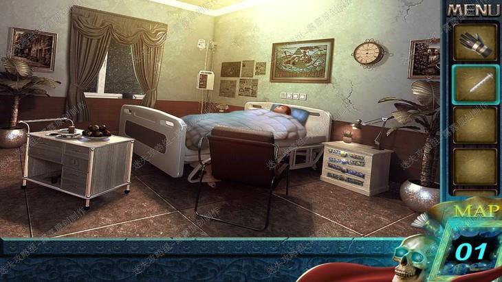 4、进入房内之后先点击床头柜放大场景,拿走床头柜上的操作指示,这个操作指示上画的是药品的使用的教程。接着点击将台灯关闭,再选择手套点击上方的灯泡将其取下。4X1