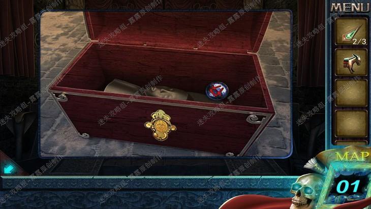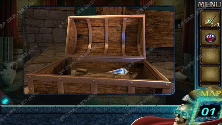 6、返回地下室内,找到一个放有半截雕像的箱子,将刚才获得的半截箱子置入其中,然后箱子就可以打开,拿走箱子里的蓝颜色的物品。6X1