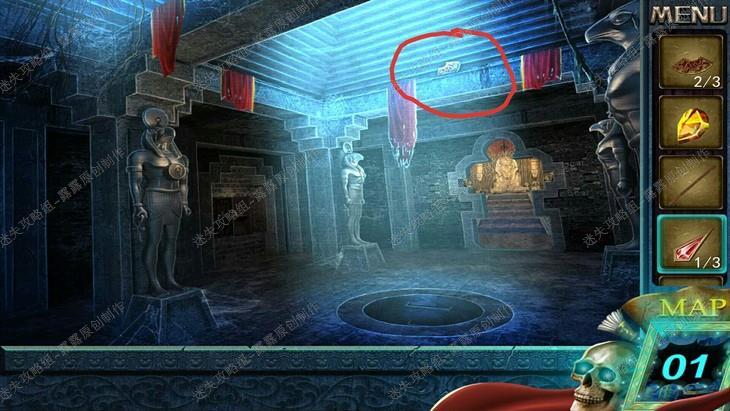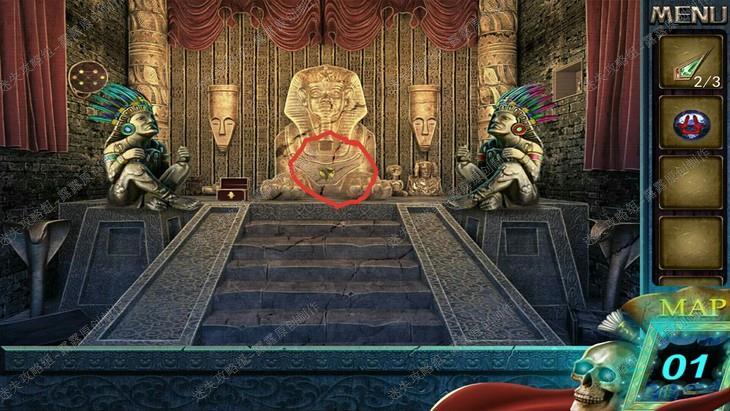 1、点击左边的石像放大场景,将刚才获得的帽子放在石像的头上,接着石像身下的盒子就会打开,拿走盒子里面的红颜色的物体。1X1