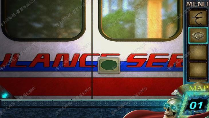 5、获得柜子内的物品之后回到走廊内,点击推车放大场景,将轮子置入其中,随即推车滑走,这时点击拿走车子下面的红色小珠子和圆形物品。5X1