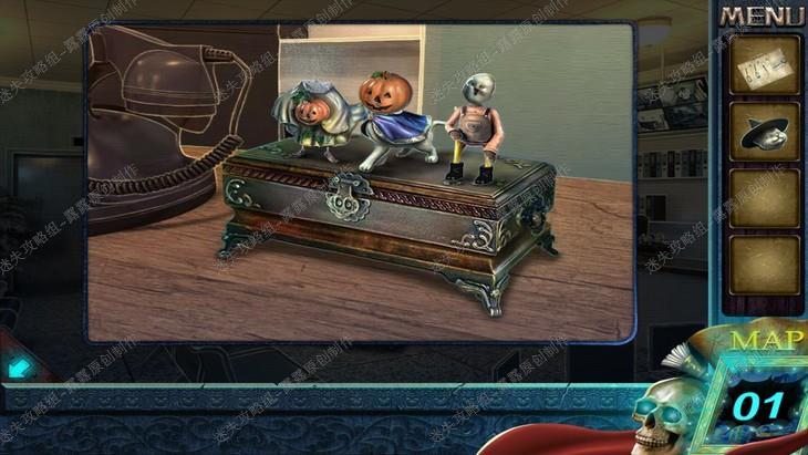 3、接着点击柜台上的玩偶放大场景,将刚才获得的头像置入第一个玩偶身上进入小游戏。这个小游戏不难,将第二个人偶的头雕移动到第三个玩偶身上,再将第一个玩偶的头雕移动到第二个玩偶的身上即可。完成小游戏之后箱子打开,拿走箱子里的小物品。3X1