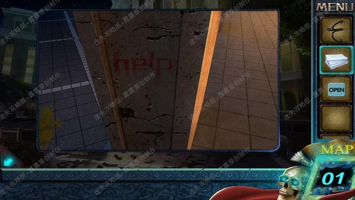 8、接着回到大门外,点击大柱子放大场景,这里有一个“OPEN”标记牌,将其拿走。8X1