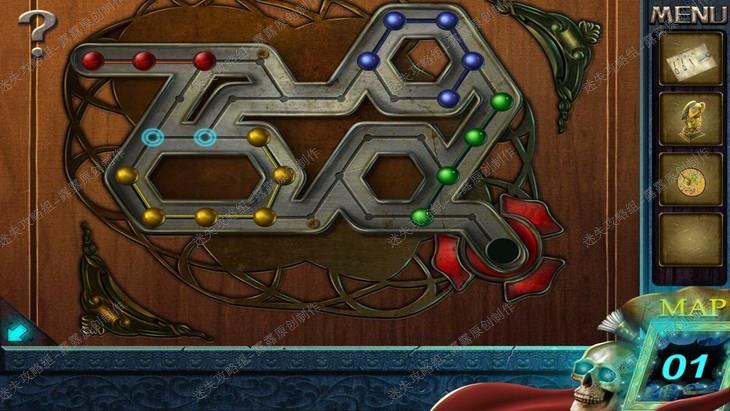 6、然后回到第二个房间内,点击窗边的柜子放大场景,将刚才获得的红色珠子置入其中,进入小游戏。这个小游戏的要求是将红色小珠子移动到最右边的洞中,完成这一小游戏柜子打开,点击拿走柜子里的锯子。6X1