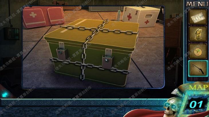 7、最后点击地上一个被铁链捆绑起来的箱子放大场景,用物品栏中的剧组将铁链拆卸,打开箱子,点击拿走箱内的雕像。7X1