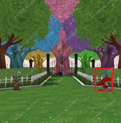 1、首先旋转镜头,来到粉红树木的镜头,在门口边上蓝色的毛毛虫,点击进入之后,毛毛虫会喷出三种烟雾,这三个字母是门口信箱的密码,为STQ 1.1
