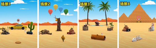 1、首先我们身处在一片沙漠之中,我们所需要做的就是想尽一切办法逃出去。首先查看一下场景1的录音机吧,发现上面有各种颜色的图案。来到场景2查看上面的气球颜色摆放高低位置位置。1.1
