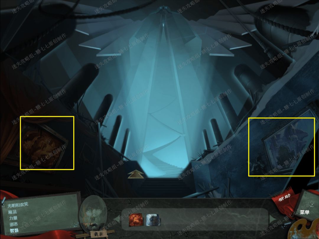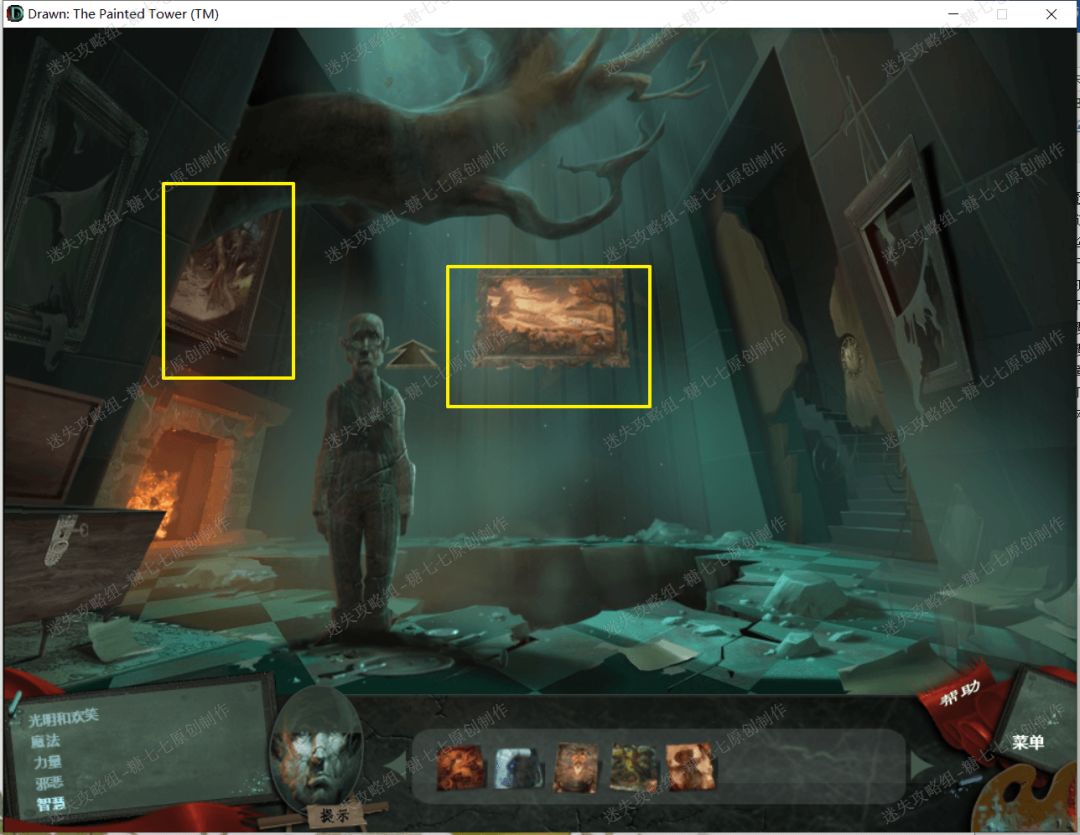 44、 从冰火走廊和二楼窗户那里以及一楼的大厅的画那里,依次拿到龙的图片、格里芬的图片、巫医的图片、树的图片和稻草人的图片。