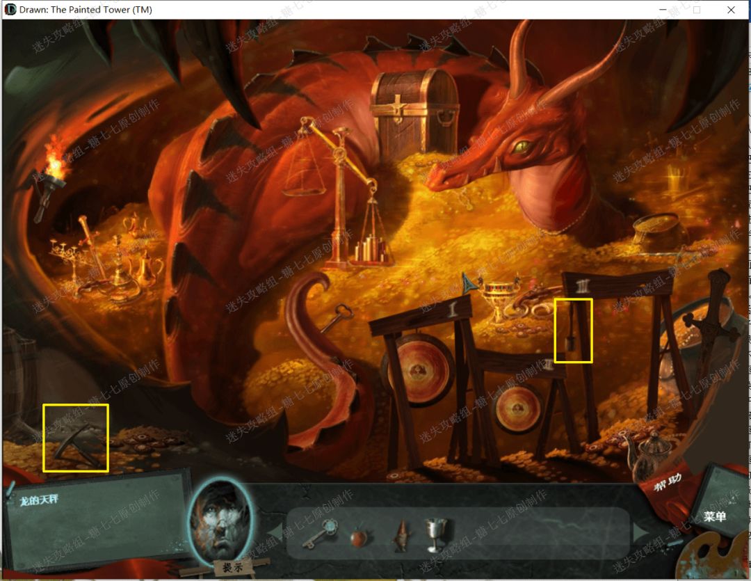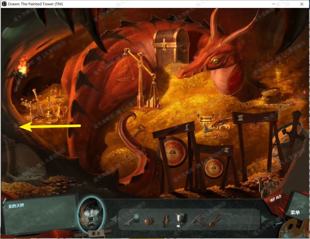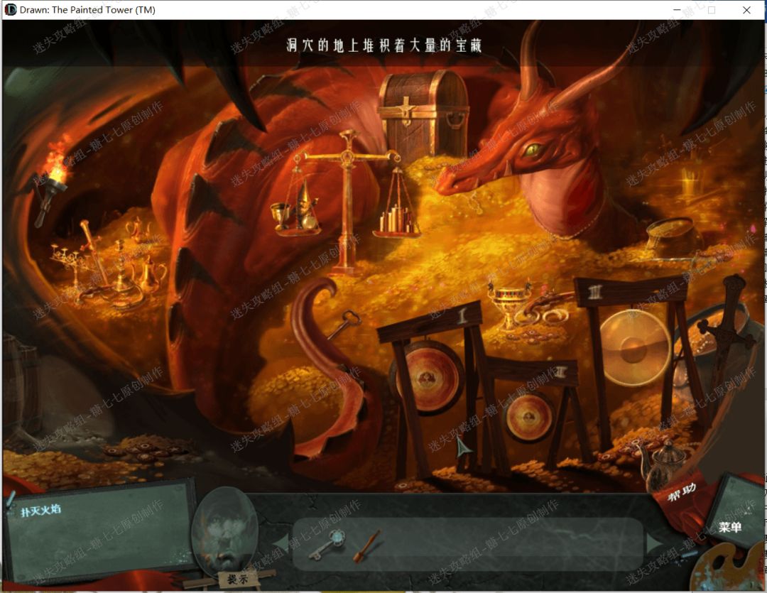 25、 回到右边的地方,把金奖杯、金苹果和金小矮人放到中间金矿石堆里的天平上,然后天平平衡,然后火龙被唤醒了,喷出火焰消除了右边被冰雪盖住的的走廊和图画。