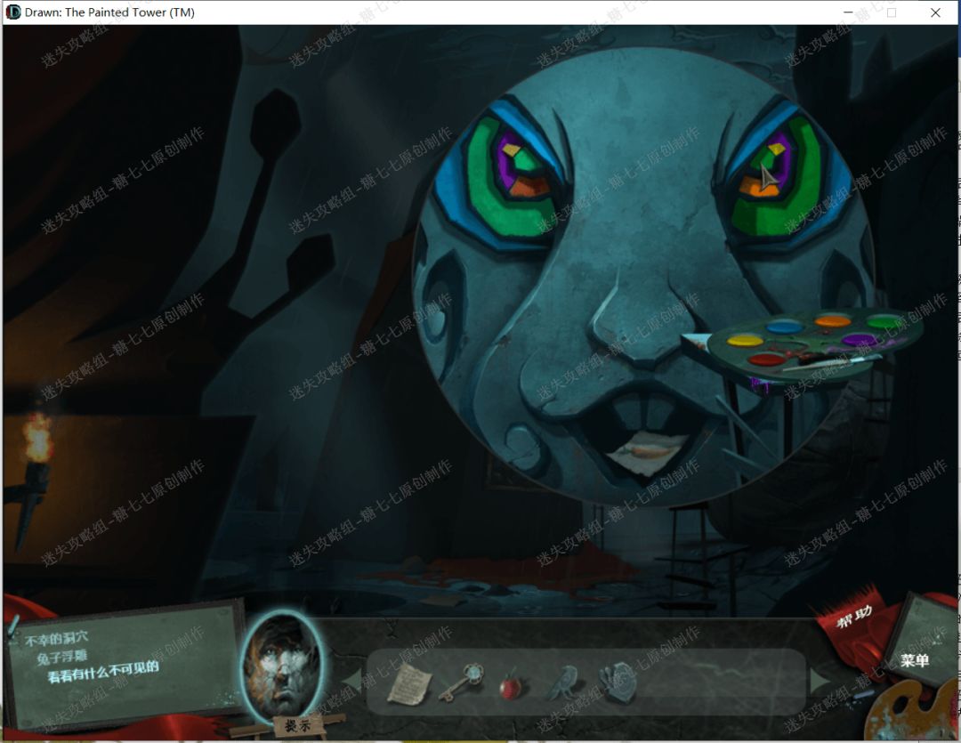 11、 然后再回到大厅,啊调色板放在右边的兔子雕像上面的右边的手脚架上,再把兔子的左眼涂成和右眼一样的颜色,然后就可以拿到兔子嘴中的胡萝卜图画。如图所示.