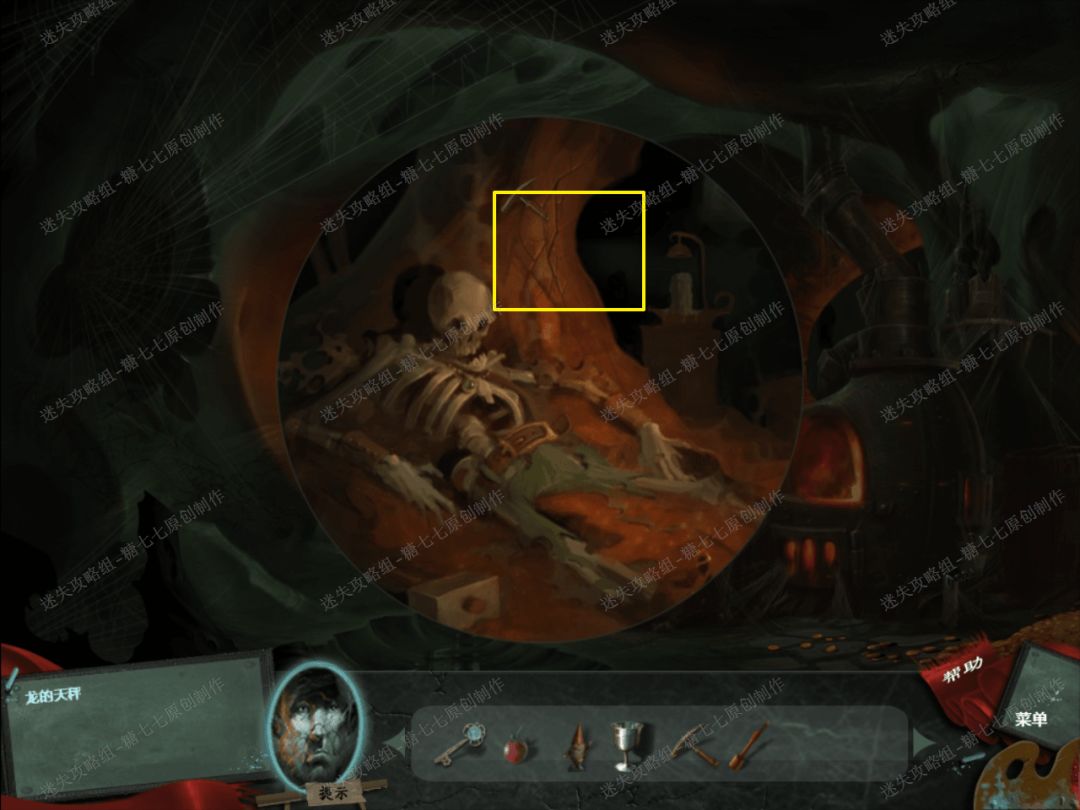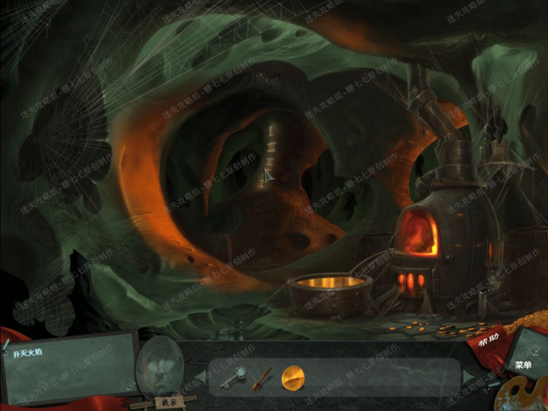 22、 用风箱给右边的火炉生火,然后就能看见后面的石柱上有5个罗马数字“ⅠⅢⅡⅡⅠ”,即为“13221”。23、 点击后面的山洞,发现里面有一具骷髅,然后用镐子凿开上面的裂开的部分,拿到里面的金矿石。