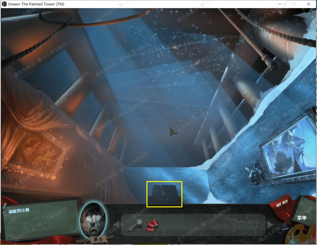 1、 然后从左边拿到凿子,还有左边相框上的红色石头,再拿到右边支架上的格里芬万能钥匙和符号表。然后顺着梯子爬上去,到最上面。