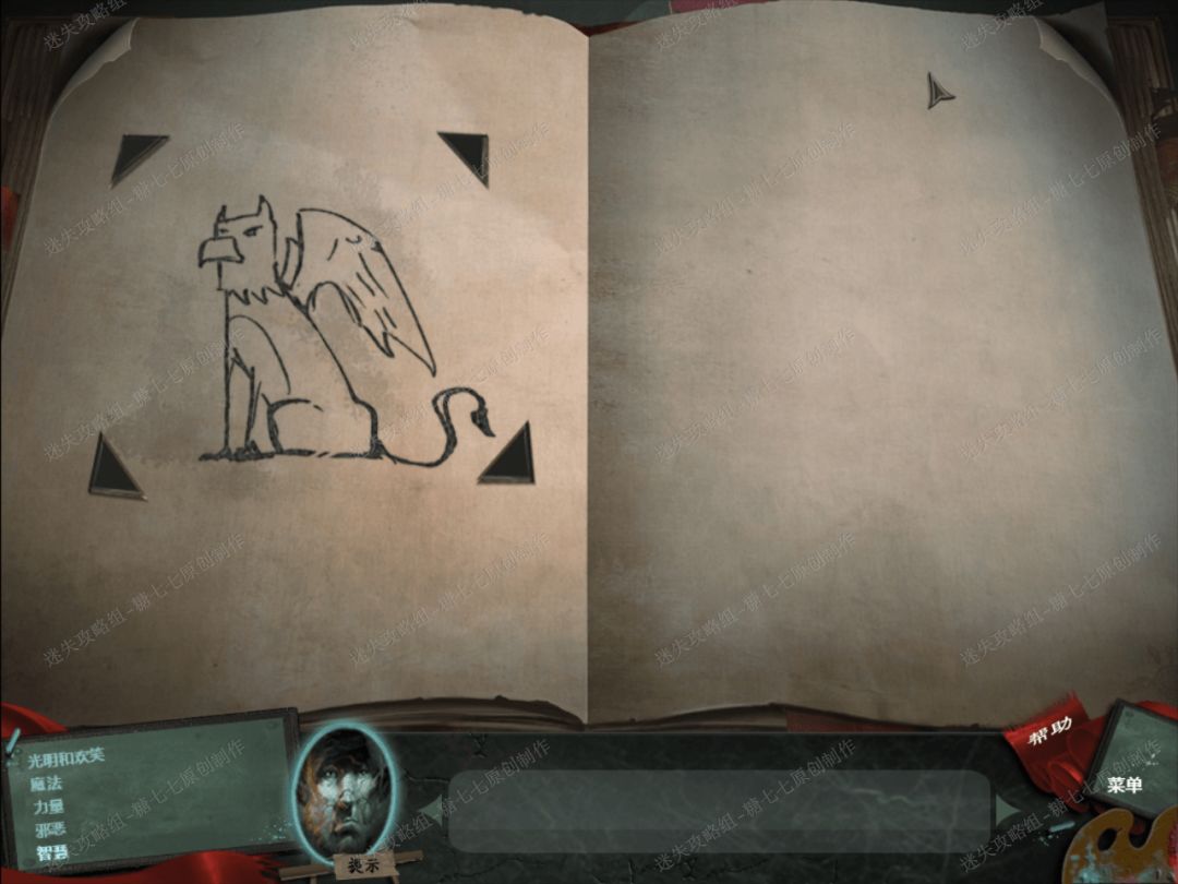 45、 然后再回到爱丽丝的书那里,把刚找到的5幅图画依次放在书中对应的图画出处,(稻草人的图画、巫医的图画、大树的图画、火龙的图画以及格里芬的图画)然后激活魔法书。46、 拿到爱丽丝的书,沿着粉笔画出的白色的楼梯,来到屋顶。