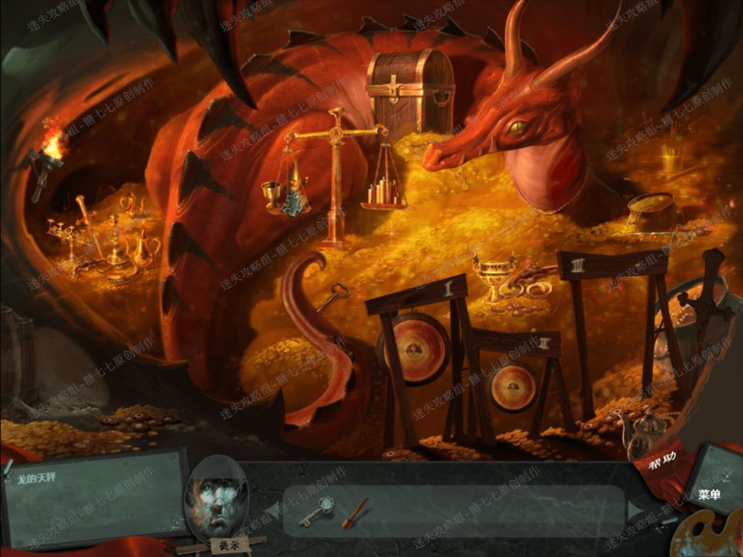 37、 用木槌敲击三个锣鼓,按照右边1次、中间2次、然后再左边1次的顺序敲击锣鼓。然后龙就睡着了,拿到龙尾巴下面的钥匙。