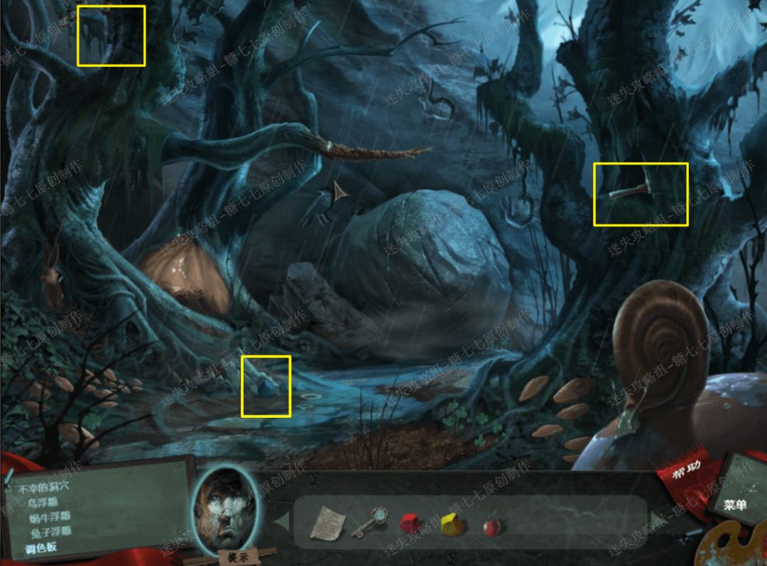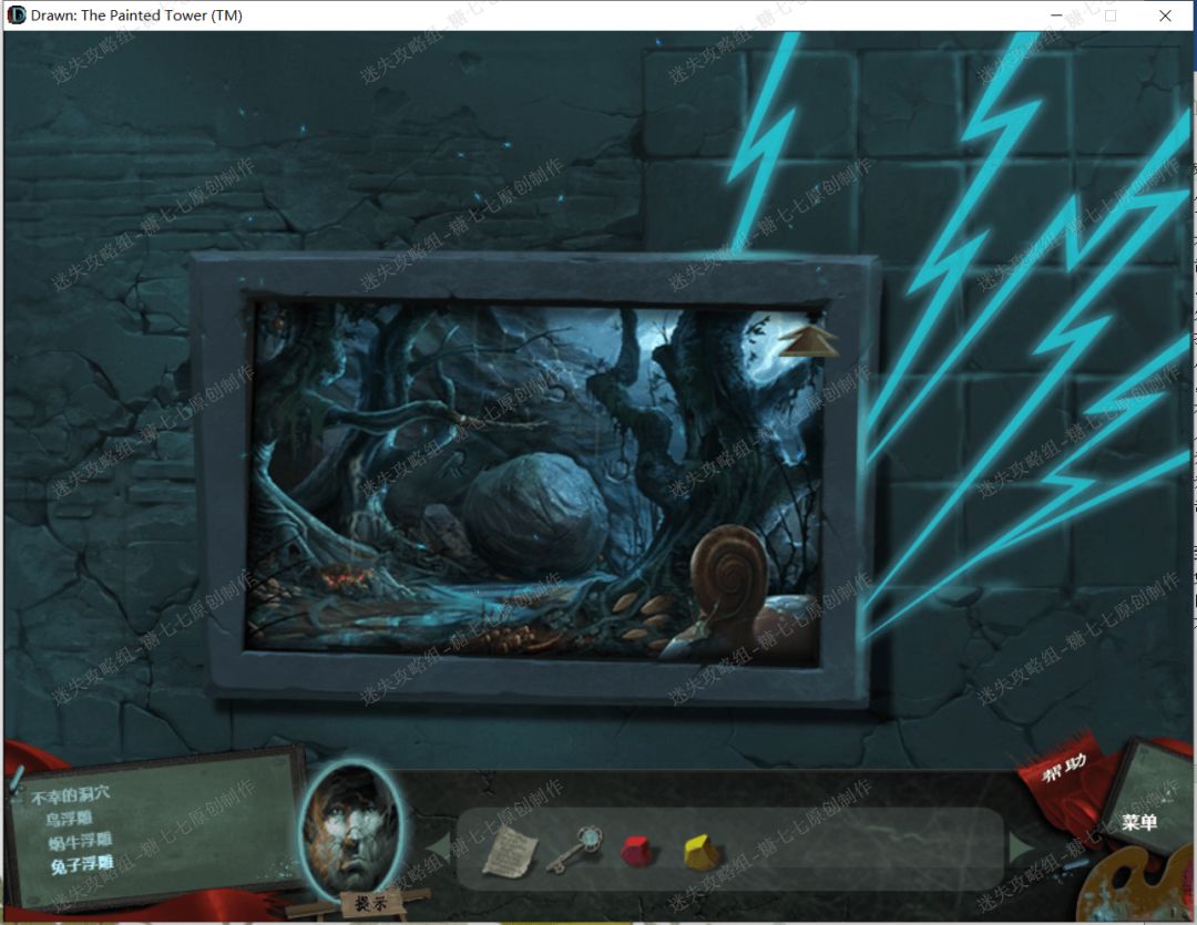 12、 返回画中,然后把胡萝卜图画放在左边的兔子树洞前面,然后兔子走开,拿到兔子身后的石头兔子。13、 然后再把石兔子、石头蜗牛和和石头鸟放在后面的大石头上的面三个相对应的形状框里面,然后洞穴就打开了。但是里面黑漆漆的什么也看不见,这时候我们就要去到画外面拿到刚才的火把,出去的时候发现画掉下来了一部分,然后拿到后面的很重的石砝码。