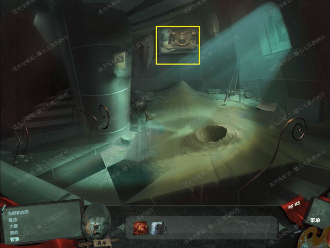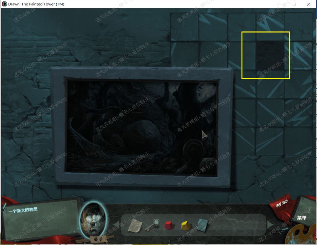 26、 然后我们去哪屏幕中间的齿轮上面的帆布。27、 点击查看右边的画,然后把帆布放在破掉的画上面,得到一张完整的画。然后我们就可以进去画中的世界了。