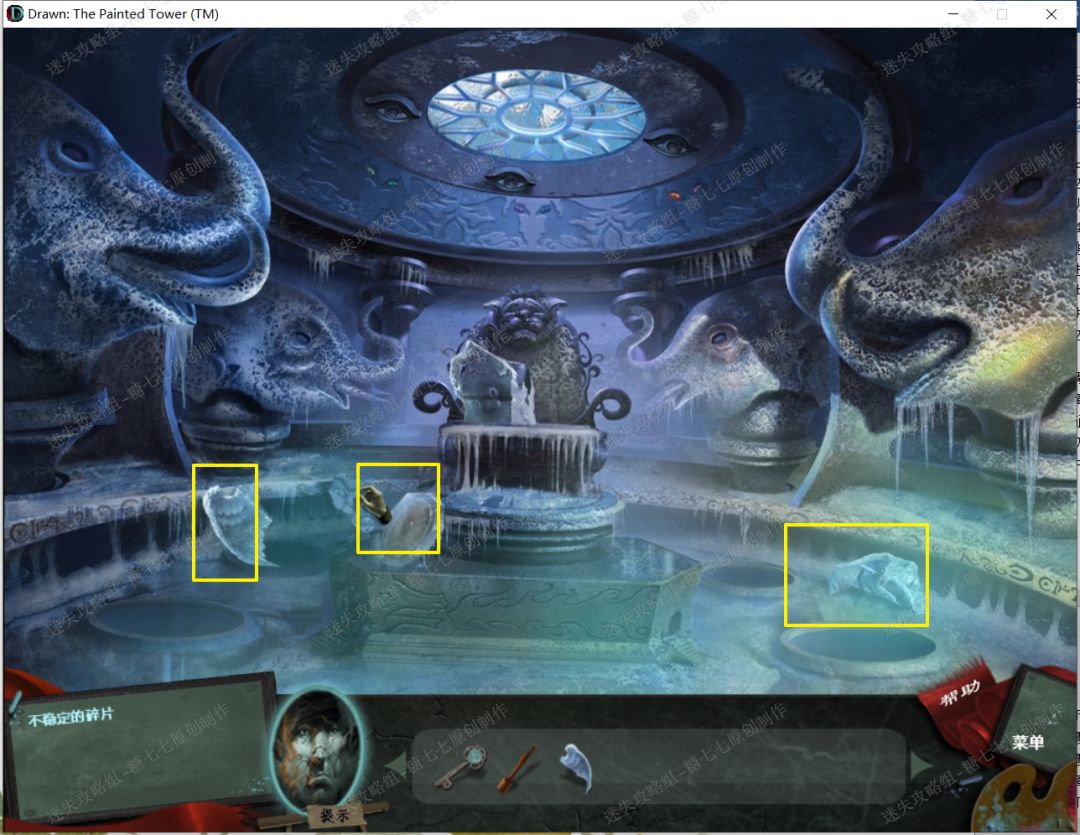 33、 然后把冰雕碎片【1】【2】【3】【4】【5】拼在石座上面,然后天窗的眼睛就可以动了。