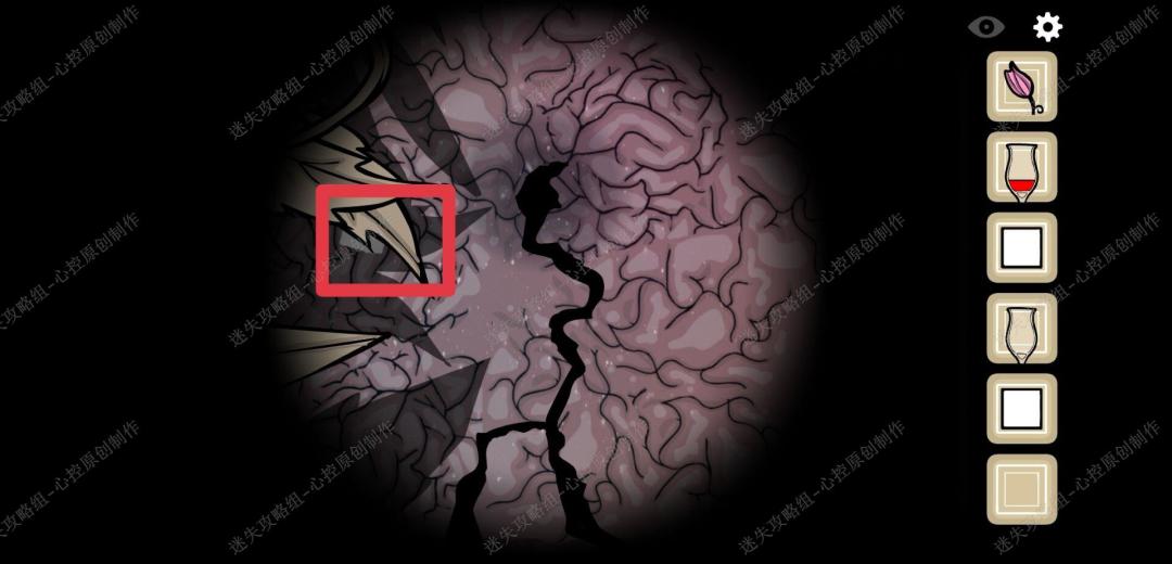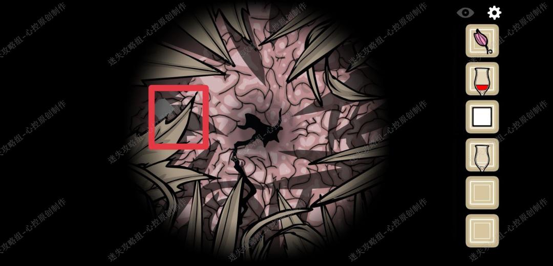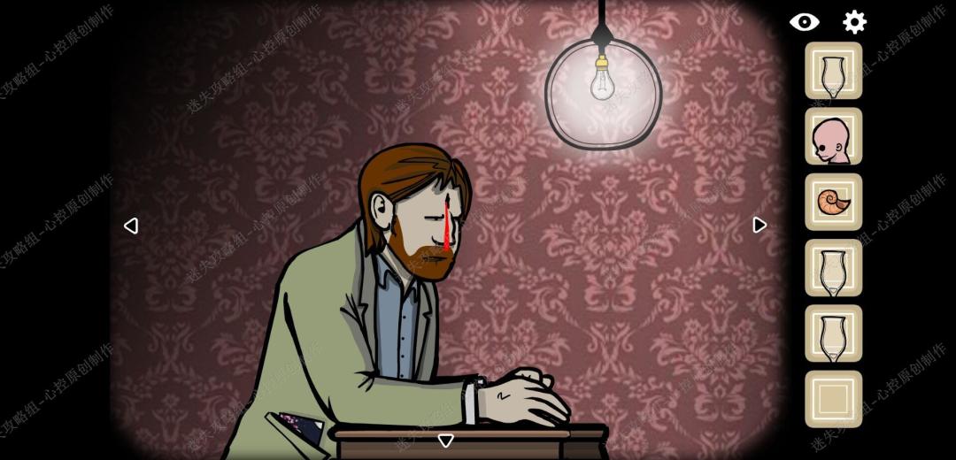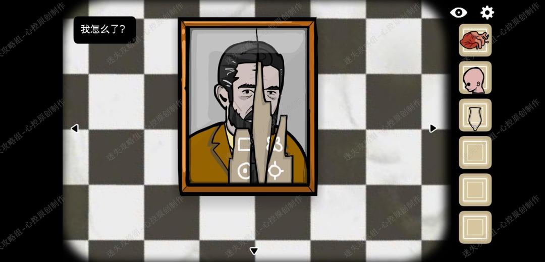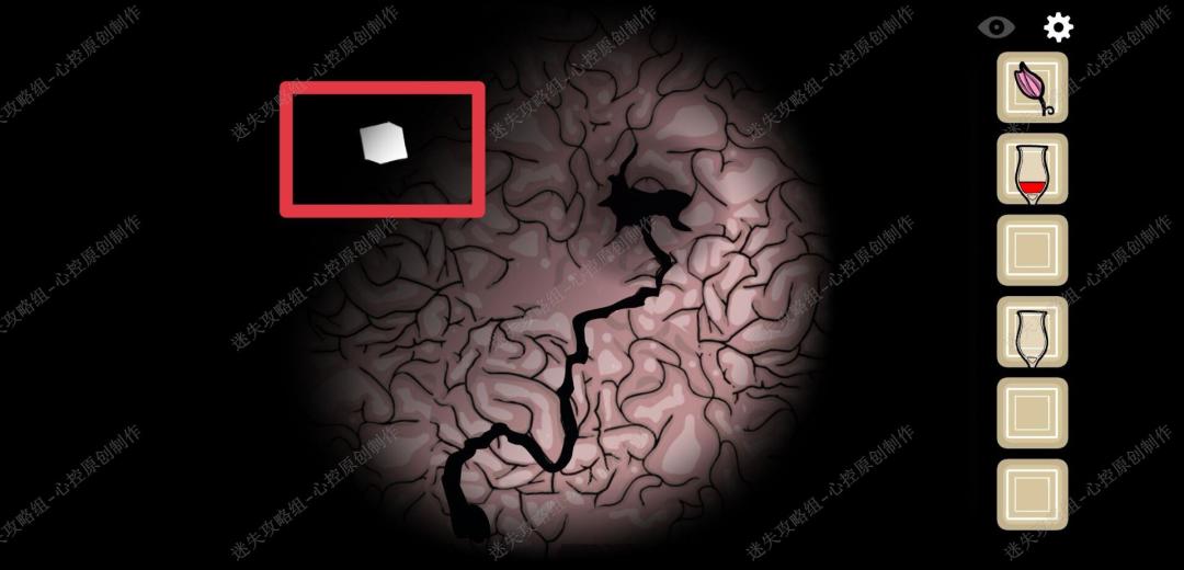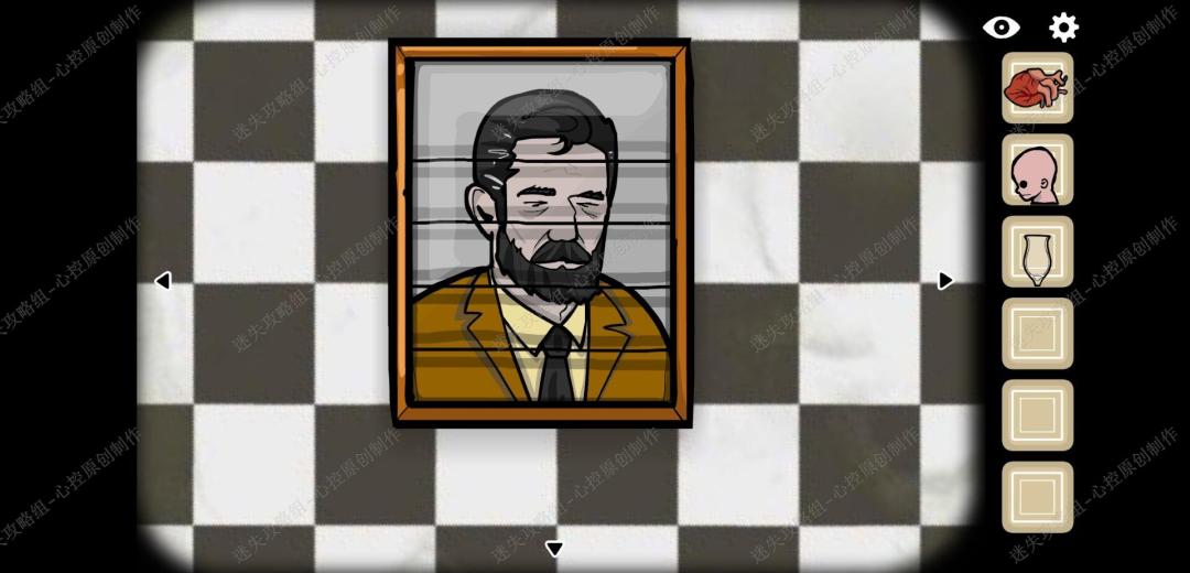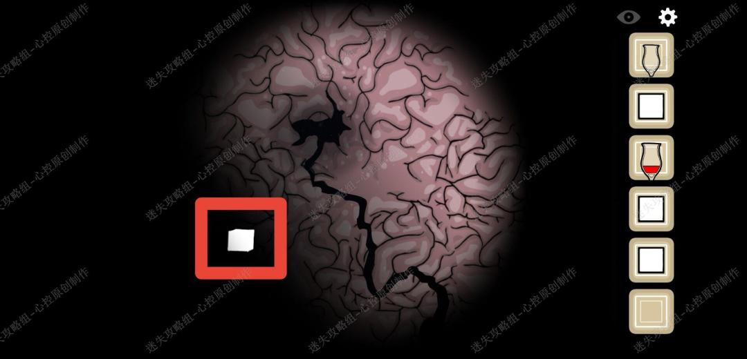 🔹15、点击男人脑袋上被枪打出来的洞,进入后先向左走,得到第一个白色方块,看到女人之后往里走,得到第二个白色方框,再往里走,得到第三个白色方块,出去再进入一次走右边的路,点击两次得到第四个白色方块,