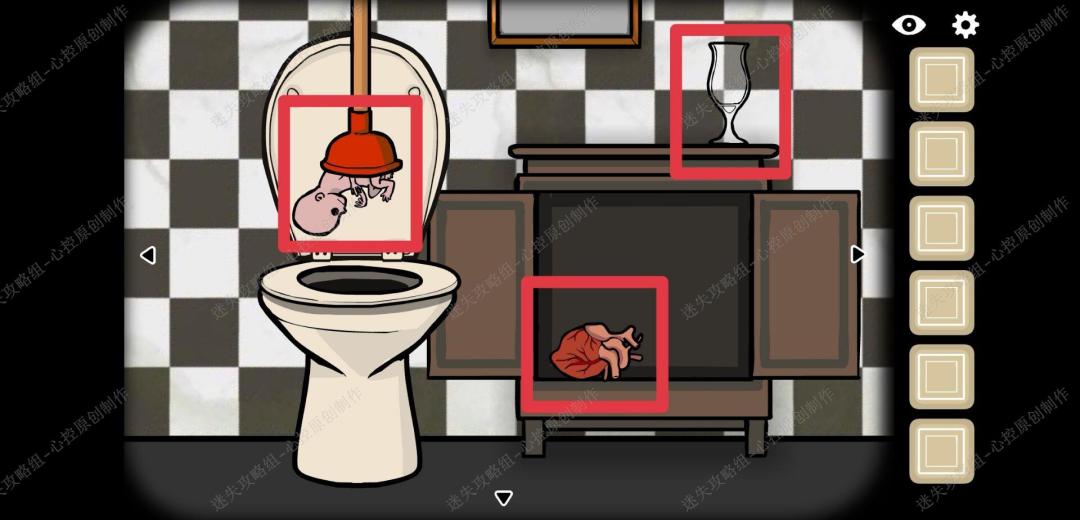 🔹8、再点击洗手间下方柜子的部分,用皮搋子得到一个婴儿,打开柜子拿到一颗心脏,拿到柜子上放的红酒杯,离开洗手间,