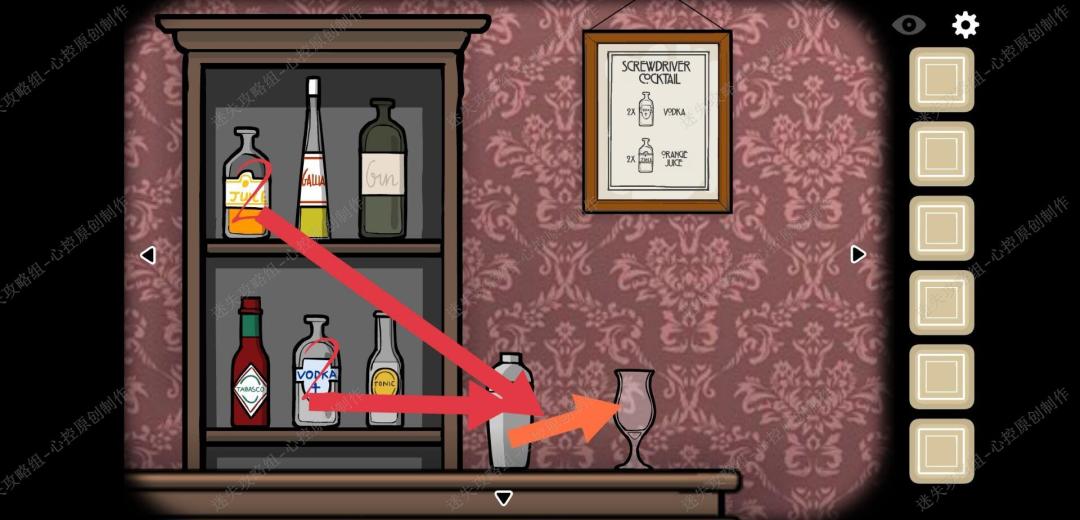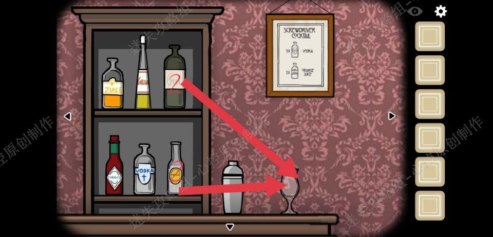🔹1、进入游戏,在吧台上有一个穿着绿色衣服的男人和一个穿着黑色西装的男人,绿色西装的男人说,别管我,我就想喝喝酒,黑色西装的男人说,给那个男人一杯酒,来到吧台右边,按照墙上的画框里提示倒两杯伏特加和两杯橙汁,得到一杯螺丝起子鸡尾酒