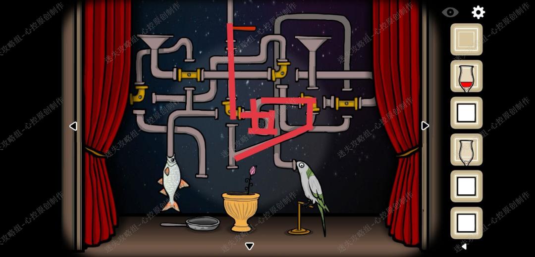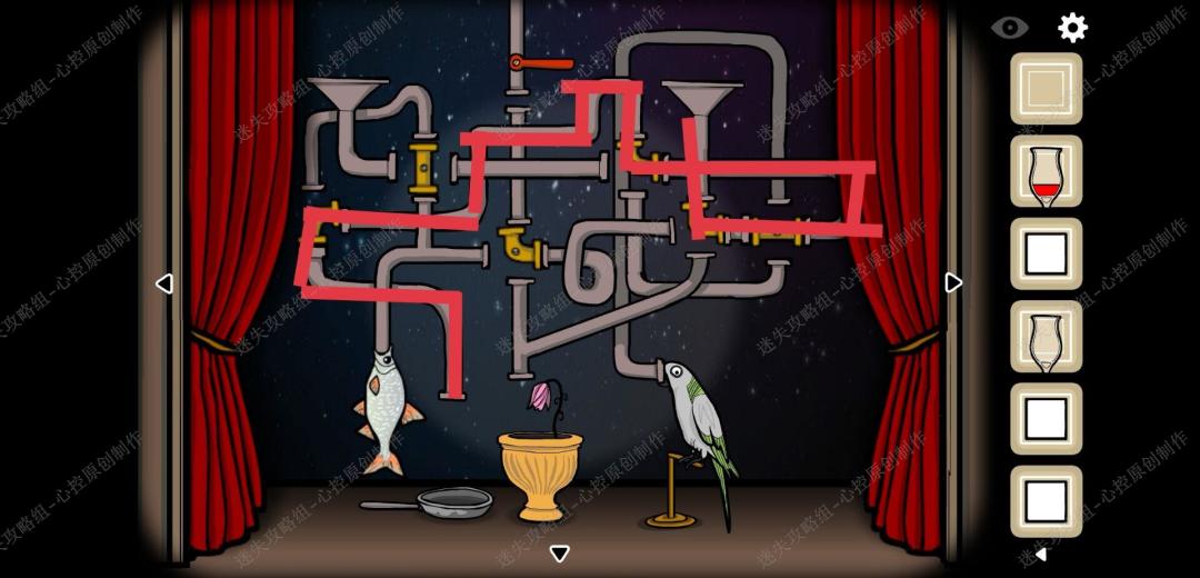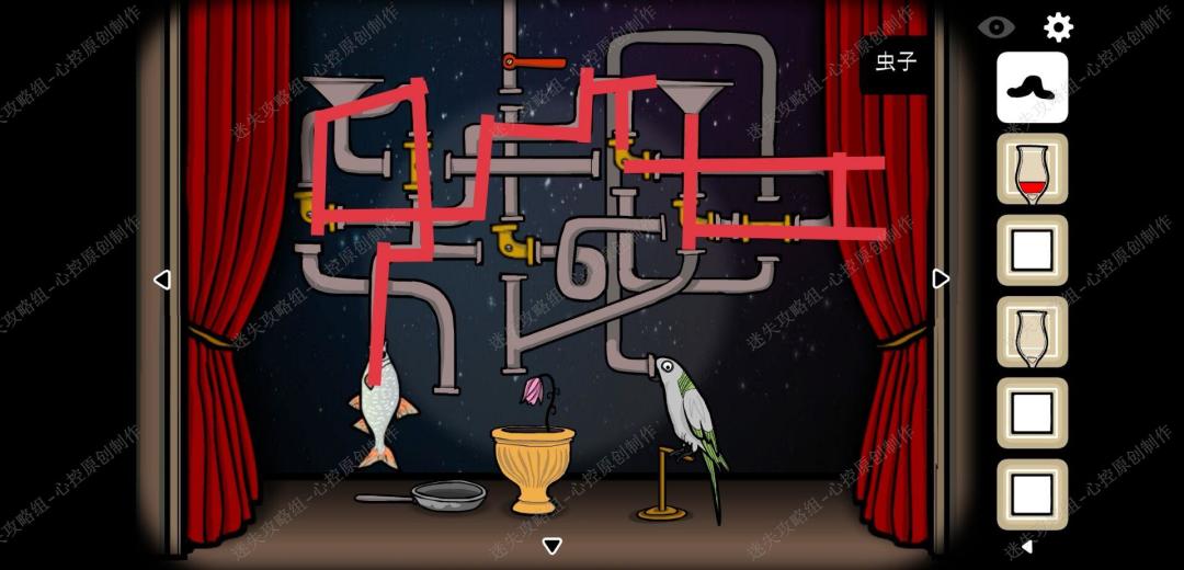 🔹16、第三幕,回到舞台把花种到黄色的花盆里,正确调节管道的摆放如图,让水落入花盆里,花盛开拿到鸟食,依旧正确摆放管道的位置,把鸟食给鸟,吃到后得到鸟蛋,依然正确摆放管道的位置,让鸡蛋落入平底锅中,得到虫子,在正确连接管道,把虫子喂入鱼的嘴中,第三幕结束,