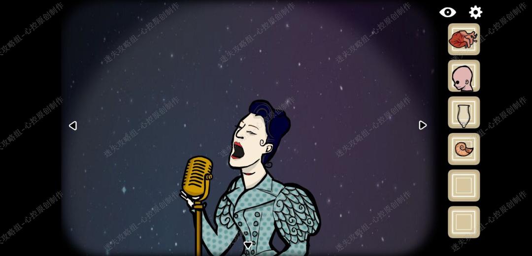 🔹11、第一幕,幕布重新打开零字就出现了一个女人,点击他,让他一直高歌就会出现一个穿着黑色礼服,戴着眼镜的女人,再点击一下,上方就会出现四个盘子,我们把我们刚刚得到的物品放到这些盘子上,顺序是贝壳婴儿心脏和帽子再点击这个女人,他会口吐一束光,嘴里长出一朵花,我们拿到花女人就谢幕了,