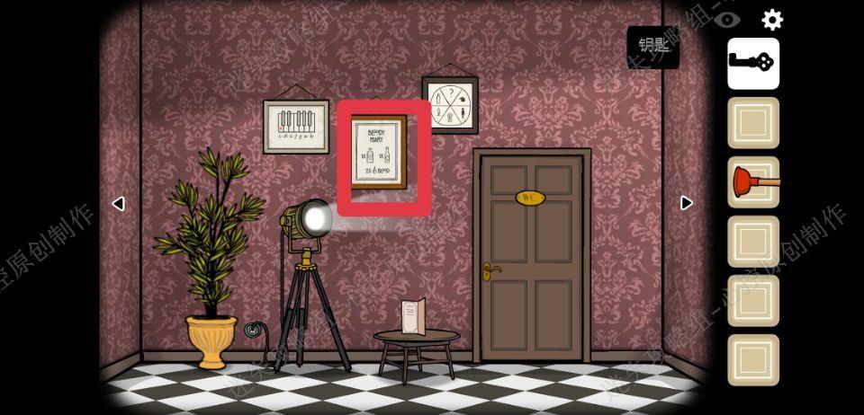 🔹14、来到洗手间的画面,点击中间的画框,得到另一个提示,一杯伏特加,一杯Tabasco辣酱,两滴血,我们得到一杯血腥玛丽,给男人喝下后,男人开枪自杀,