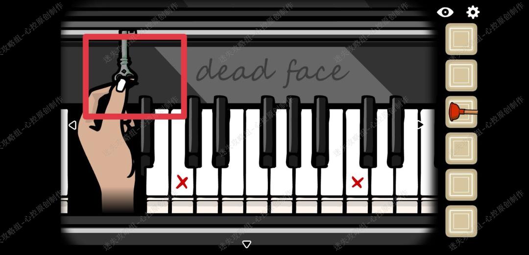 🔹6、画面向左转,点击钢琴,上面写着dead face,按照我们刚刚记下来的顺序,正确弹奏钢琴的琴键,会有一只手伸出来,我们跟着手的提示弹奏右侧红色叉范围的钢琴键,正确弹奏之后,这只手就会送出来一个钥匙,