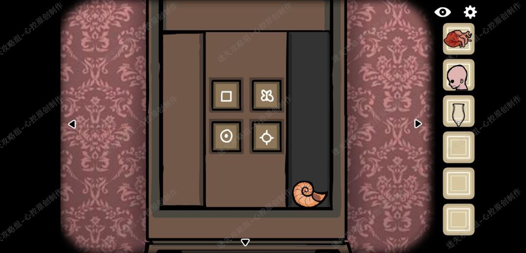 🔹9、向左走,来到左边的柜子,按照刚刚我们在洗手间得到的提示,打开右侧的柜子,得到一个贝壳,